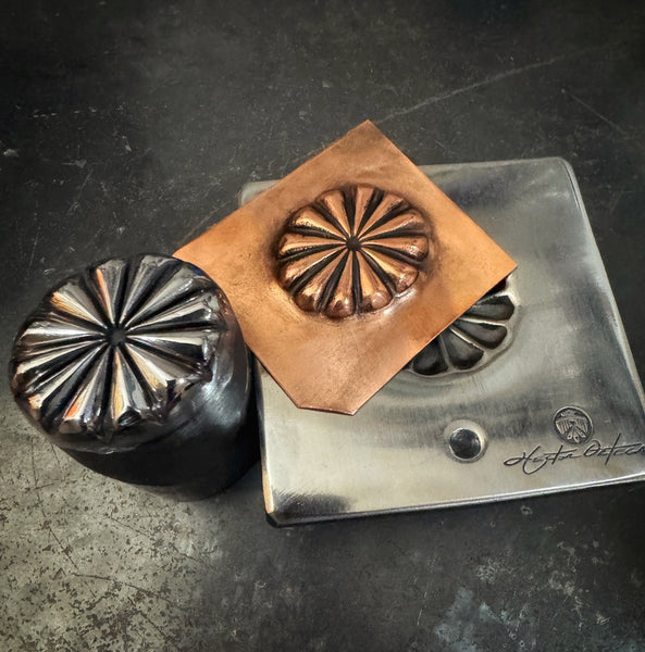 Handmade Traditional Repousse  Southwestern M/F Concho Die. Hand Sculpted and  from heat treated and tempered tool steel. Picture shows results after secondary processing to ensure ease of use.